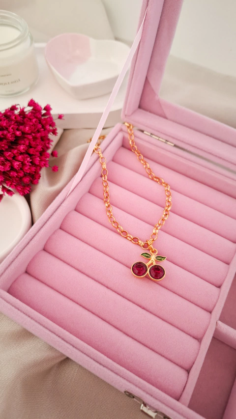 Este encantador colar apresenta uma corrente elo português com 50 cm de comprimento, ideal para realçar qualquer look. O pingente em forma de cereja traz um charme especial, perfeito para quem ama detalhes únicos.
